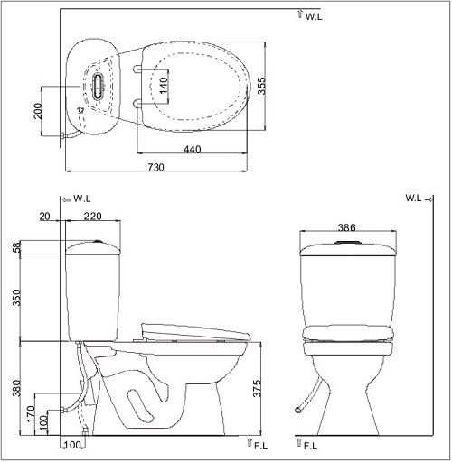 • Tâm xả: 170 mm - Kiểu xả : thoát ngang