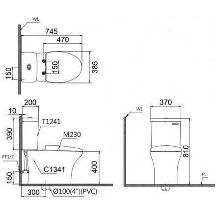 Bản vẽ kỹ thuật Bồn Cầu Nắp Rửa Cơ CAESAR CD1341/TAF050 2 Khối