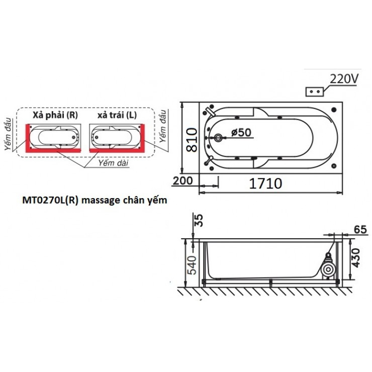 Bản vẽ kỹ thuật bồn tắm dài Caesar MT0270L(R) 1,7M