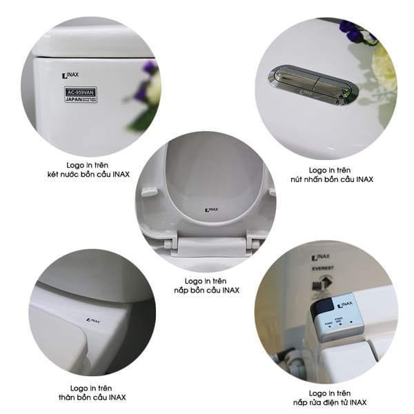 Những sản phẩm bồn cầu, Chậu rửa Lavabo INAX thật đều được in tem mác, logo, nhãn hiệu của thương hiệu INAX đầy đủ đối với bệt hai khối tách rời ở các bộ phận như két nước, thân bồn cầu và nắp bồn cầu.Các nét in logo thương hiệu sắc nét, rõ ràng, đúng quy cách.