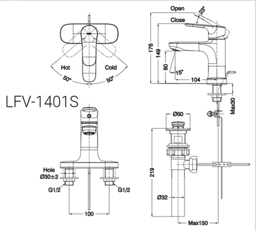 Bản vẽ kỹ thuật dùng để lắp đặt cho Vòi Chậu Lavabo INAX LFV-1401S Nóng Lạnh